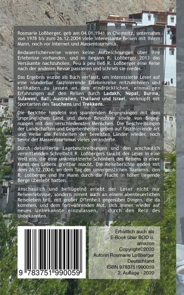 Rosmarie Loßberger, geb. am 04.01.1941 in Chemnitz, unternahm von 1978 bis zum 26.12.2004 viele interessante Reisen mit ihrem Mann, noch vor Internet und Massentourismus.Bedauerlicherweise waren keine Aufzeichnungen über ihre Erlebnisse vorhanden, und so begann R. Loßberger 2013 das Versäumte nachzuholen. Peu à peu ließ R. Loßberger eine Reise nach der anderen Revue passieren und schrieb sie nieder. Das Ergebnis wurde als Buch verfasst, um interessierte Leser auf eine wunderbar faszinierende Erlebnisreise mitzunehmen und teilhaben zu lassen an den eindrücklichen, einmaligen Erfahrungen auf den Reisen durch Ladakh, Nepal, Burma, Sulawesi, Bali, Australien, Thailand und Israel, verknüpft mit Sportarten des Tauchens und Trekkens.Die Berichte handeln von spannenden Begegnungen mit dem ursprünglichen Land und deren Bewohner sowie von Begegnungen mit den verschiedensten Menschen. Die Beschreibungen der Landschaften und Gegebenheiten geben auf faszinierende Art und Weise die Feinheiten der bereisten Länder wieder, noch bevor der Massentourismus vieles veränderte.Durch detaillierte Lagebeschreibungen und den anschaulich vermittelnden Schreibstil R. Loßbergers taucht der Leser in eine Welt ein, die eine unkomplizierte Schönheit des Reisens in einer Kunst des Lebens greifbar macht. Die Reiseberichte enden mit dem 26.12.2004, an dem Tag des unvergesslichen Tsunamis, den R. Loßberger und ihr Mann durch die Flucht in höher liegende Berge überlebt hatten.Anschaulich und beflügelnd erlebt der Leser nicht nur Reiseerlebnisse, sondern nimmt auch an einem abenteuerlichen Reiseleben teil, mit großer Offenheit gegenüber Dingen, die da kommen, und dem fortwährenden Mut, sich immer wieder auf neues Unbekannte einzulassen, - durch den Reiz des Unbekannten.