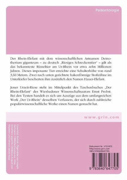 Fachbuch aus dem Jahr 2010 im Fachbereich Biologie - Evolution, , Veranstaltung: -, Sprache: Deutsch, Abstract: Der Rhein-Elefant mit dem wissenschaftlichen Artnamen Deinotherium giganteum - zu deutsch "Riesiges Schreckenstier" - gilt als das bekannteste Rüsseltier am Ur-Rhein vor etwa zehn Millionen Jahren. Dieses imposante Tier erreichte eine Schulterhöhe von rund 3,60 Metern. Zwei nach unten gerichtete hakenförmige Stoßzähne im Unterkiefer bescherten ihm zusätzlich den Namen Hauer-Elefant.Jener Urzeit-Riese steht im Mittelpunkt des Taschenbuches "Der Rhein-Elefant" des Wiesbadener Wissenschaftsautors Ernst Probst. Bei den Texten handelt es sich um Auszüge aus dem umfangreichen Werk "Der Ur-Rhein" desselben Verfassers, der sich durch zahlreiche populärwissenschaftliche Werke einen Namen gemacht hat.Der Ur-Rhein in Rheinhessen floss ab dem Raum Worms - weiter westlich als in der Gegenwart - auf die Binger Pforte zu. Der damalige Fluss berührte nicht - wie heute - die Gegend von Oppenheim, Nierstein, Nackenheim, Mainz, Wiesbaden und Ingelheim. Das geschah erst später.Die Ablagerungen des Ur-Rheins in Rheinhessen werden als Dinotheriensande bezeichnet, weil sie häufig Zähne und Knochen des Rüsseltieres Deinotherium giganteum enthalten. In der Literatur findet man teilweise auch den Namen Dinotherium giganteum.Über die exotische Tierwelt am Ur-Rhein informiert das ebenfalls nach Deinotherium benannte Dinotherium-Museum in Eppelsheim. In der Gegend von Eppelsheim lebten vor rund zehn Millionen Jahren Rüsseltiere, Säbelzahnkatzen, Bärenhunde, Tapire, Nashörner, krallenfüßige Huftiere, Ur-Pferde und sogar Menschenaffen.Eppelsheim genießt weltweit in der Wissenschaft einen guten Ruf. Zusammen mit dem Pariser Montmartre gehört der kleine Ort südlich von Alzey zu jenen großartigen Fossillagerstätten, mit denen die Erforschung ausgestorbener Säugetiere in Europabegonnen hat.Das Taschenbuch "Der Rhein-Elefant" ist drei