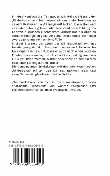 Mit dem Kauf von drei Tetrapoden will Heinrich Nissen, der 'Rinderbaron von Sylt', eigentlich nur mehr Touristen zu seinem Restaurant in Wenningstedt locken. Dann aber wird eines der Betonungeheuer über Nacht mit der Abbildung des nackten russischen Machthabers verziert und ein anderes verschwindet gleich ganz. An seiner Stelle findet die Polizei zwei abgetrennte menschliche Füße. Michael Brunner, der Leiter der Kriminalpolizei Sylt, hat bereits genug damit zu kämpfen, dass seine Schwester ihn für einige Tage besucht. Dass er auch noch einen brutalen Mörder fassen muss, von dessen Opfer bislang nur zwei Füße gefunden wurden, wirbelt sein sonst so geruhsames Inselleben gehörig durcheinander. Die gemeinsamen Ermittlungen mit dem abenteuerlustigen 'Rinderbaron' bringen den Kriminalhauptkommissar und seine Schwester gleich mehrfach in Gefahr. 'Der Rinderbaron von Sylt' ist ein Kriminalroman, dessen spannende Geschichte von wahren Ereignissen und existierenden Orten der Insel Sylt inspiriert wurde. Er ist der erste einer Reihe von Sylt-Romanen.