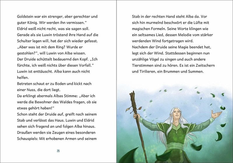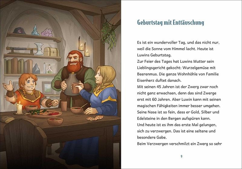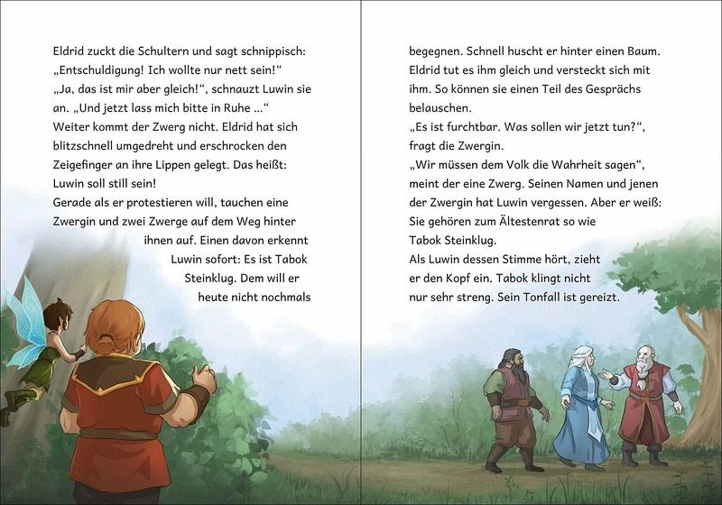 Der größte Wunsch des jungen Zwergs Luwin ist es, in die Gemeinschaft der Großen aufgenommen zu werden. Aber beim Ältestenrat stößt er damit auf taube Ohren - die Hundert-Hügel-Zwerge haben andere Sorgen. Es ist der Zufall, der das Geheimnis lüftet: König Gorins Ring wurde gestohlen!Damit beginnt Luwins Abenteuerreise. Gemeinsam mit der Pixie Eldrid tritt er den grimmigen Erzzwergen gegenüber und macht Bekanntschaft mit einem Wüstenork. Und natürlich darf die magische Unterstützung eines Elfen-Druiden nicht fehlen.