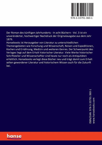 Der Roman des künftigen Jahrhunderts - In acht Büchern - Vol. 3 ist ein unveränderter, hochwertiger Nachdruck der Originalausgabe aus dem Jahr 1879.Hansebooks ist Herausgeber von Literatur zu unterschiedlichen Themengebieten wie Forschung und Wissenschaft, Reisen und Expeditionen, Kochen und Ernährung, Medizin und weiteren Genres. Der Schwerpunkt des Verlages liegt auf dem Erhalt historischer Literatur. Viele Werke historischer Schriftsteller und Wissenschaftler sind heute nur noch als Antiquitäten erhältlich. Hansebooks verlegt diese Bücher neu und trägt damit zum Erhalt selten gewordener Literatur und historischem Wissen auch für die Zukunft bei.