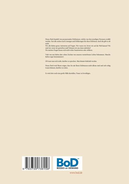Dieses Buch handelt von paranormalen Erlebnissen, welche von den jeweiligen Personen erzählt werden. Fast alle suchen nach Lösungen und Erklärungen für diese Erlebnisse, doch die gibt es oft nicht.Wir alle hätten gerne Antworten auf Fragen. Wer waren wir, bevor wir auf die Welt kamen? Wo sind wir, wenn wir gestorben sind? Können wir uns dann mitteilen?Die meisten Fragen lassen sich nicht sicher beantworten oder erklären. Viele von uns haben aber schon Zeichen von unseren verstorbenen Lieben bekommen. Manche haben sogar kommuniziert.Oft traut man sich nicht, darüber zu sprechen. Man könnte belächelt werden.Dieses Buch wird Ihnen zeigen, dass Sie mit Ihren Erlebnissen nicht alleine sind und sich ruhig trauen können, darüber zu reden.Es wird aber auch eine große Hilfe darstellen, Trauer zu bewältigen.