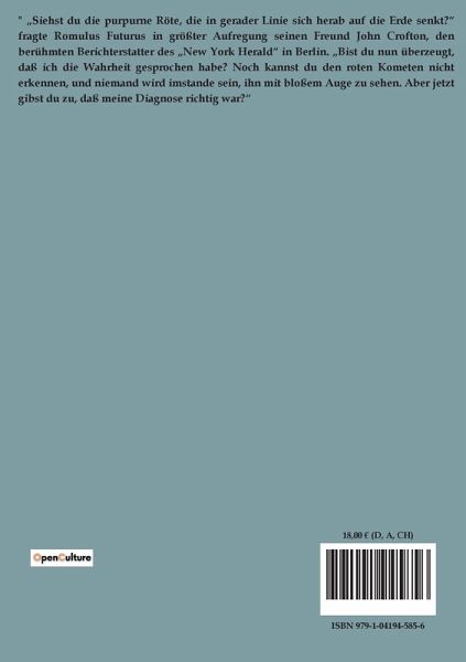" ¿Siehst du die purpurne Röte, die in gerader Linie sich herab auf die Erde senkt?¿ fragte Romulus Futurus in größter Aufregung seinen Freund John Crofton, den berühmten Berichterstatter des ¿New York Herald¿ in Berlin. ¿Bist du nun überzeugt, daß ich die Wahrheit gesprochen habe? Noch kannst du den roten Kometen nicht erkennen, und niemand wird imstande sein, ihn mit bloßem Auge zu sehen. Aber jetzt gibst du zu, daß meine Diagnose richtig war?¿