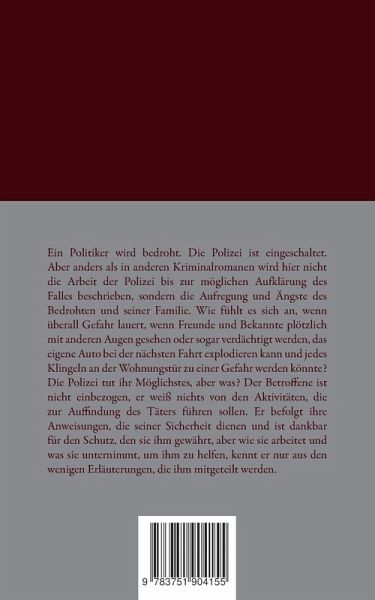 Ein Politiker wird bedroht. Die Polizei ist eingeschaltet. Aber anders als in anderen Kriminalromanen wird hier nicht die Arbeit der Polizei bis zur möglichen Aufklärung des Falles beschrieben, sondern die Aufregung und Ängste des Bedrohten und seiner Familie. Wie fühlt es sich an, wenn überall Gefahr lauert, wenn Freunde und Bekannte plötzlich mit anderen Augen gesehen oder sogar verdächtigt werden, das eigene Auto bei der nächsten Fahrt explodieren kann und jedes Klingeln an der Wohnungstür zu einer Gefahr werden könnte? Die Polizei tut ihr Möglichstes, aber was? Der Betroffene ist nicht einbezogen, er weiß nichts von den Aktivitäten, die zur Auffindung des Täters führen sollen. Er befolgt ihre Anweisungen, die seiner Sicherheit dienen und ist dankbar für den Schutz, den sie ihm gewährt, aber wie sie arbeitet und was sie unternimmt, um ihm zu helfen, kennt er nur aus den wenigen Erläuterungen, die ihm mitgeteilt werden.