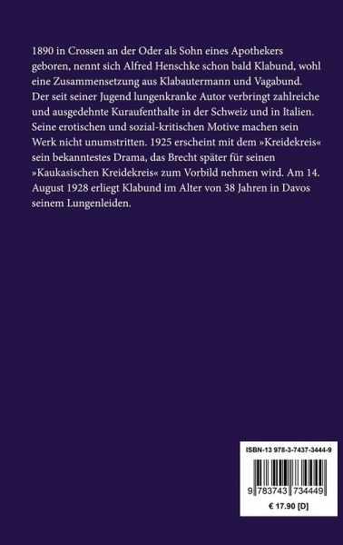 1890 in Crossen an der Oder als Sohn eines Apothekers geboren, nennt sich Alfred Henschke schon bald Klabund, wohl eine Zusammensetzung aus Klabautermann und Vagabund. Der seit seiner Jugend lungenkranke Autor verbringt zahlreiche und ausgedehnte Kuraufenthalte in der Schweiz und in Italien. Seine erotischen und sozial-kritischen Motive machen sein Werk nicht unumstritten. 1925 erscheint mit dem "Kreidekreis" sein bekanntestes Drama, das Brecht später für seinen "Kaukasischen Kreidekreis" zum Vorbild nehmen wird. Am 14. August 1928 erliegt Klabund im Alter von 38 Jahren in Davos seinem Lungenleiden.