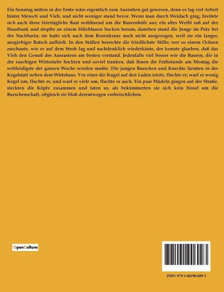 Ein Sonntag mitten in der Ernte wäre eigentlich zum Ausruhen gut gewesen, denn es lag viel Arbeit hinter Mensch und Vieh, und nicht weniger stand bevor. Wenn man durch Weidach ging, breitete sich auch diese feiertägliche Rast wohltuend um die Bauernhöfe aus; ein altes Weibl saß auf der Hausbank und stopfte an einem blitzblauen Socken herum, daneben stand die Junge im Putz bei der Nachbarin; sie hatte sich nach dem Rosenkranz noch nicht ausgezogen, weil sie ein langer, ausgiebiger Ratsch aufhielt. In den Ställen herrschte die friedlichste Stille; wer so einem Ochsen zuschaute, wie er auf dem Stroh lag und nachdenklich wiederkäute, der konnte glauben, daß das Vieh den Genuß des Ausrastens am besten verstand. Jedenfalls viel besser wie die Bauern, die in der rauchigen Wirtsstube hockten und soviel tranken, daß ihnen die Frühstunde am Montag die wehleidigste der ganzen Woche werden mußte. Die jungen Burschen und Knechte lärmten in der Kegelstatt neben dem Wirtshaus. Vor einer die Kugel auf den Laden setzte, fluchte er; warf er wenig Kegel um, fluchte er, und warf er viele um, fluchte er auch. Ein paar Mädeln gingen auf der Straße, steckten die Köpfe zusammen und taten so, als bekümmerten sie sich kein bissel um die Burschenschaft, obgleich sie bloß derentwegen vorbeischlichen.