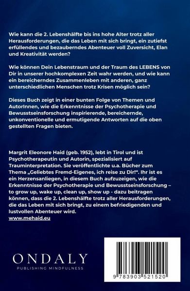 Wie kann die 2. Lebenshälfte bis ins hohe Alter trotz aller Herausforderungen, die das Leben mit sich bringt, ein zutiefst erfüllendes und bezauberndes Abenteuer voll Zuversicht, Elan und Kreativität werden?Wie können Dein Lebenstraum und der Traum des LEBENS von Dir in unserer hochkomplexen Zeit wahr werden, und wie kann ein bereicherndes Zusammenleben mit anderen, ganz unterschiedlichen Menschen trotz Krisen möglich sein?Dieses Buch zeigt in einer bunten Folge von Themen und AutorInnen, wie die Erkenntnisse der Psychotherapie und Bewusstseinsforschung inspirierende, bereichernde, unkonventionelle und ermutigende Antworten auf die oben gestellten Fragen bieten.