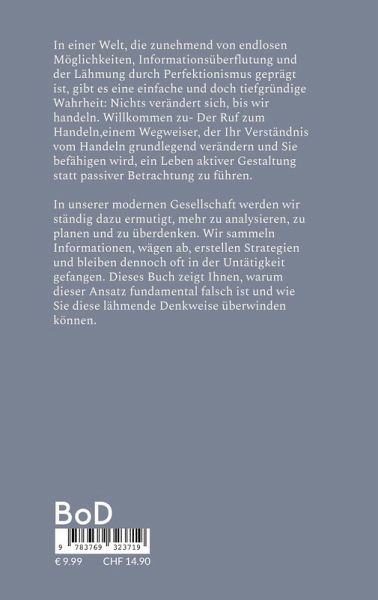 In einer Welt, die zunehmend von endlosen Möglichkeiten, Informationsüberflutung und der Lähmung durch Perfektionismus geprägt ist, gibt es eine einfache und doch tiefgründige Wahrheit: Nichts verändert sich, bis wir handeln. Willkommen zu- Der Ruf zum Handeln,einem Wegweiser, der Ihr Verständnis vom Handeln grundlegend verändern und Sie befähigen wird, ein Leben aktiver Gestaltung statt passiver Betrachtung zu führen. In unserer modernen Gesellschaft werden wir ständig dazu ermutigt, mehr zu analysieren, zu planen und zu überdenken. Wir sammeln Informationen, wägen ab, erstellen Strategien und bleiben dennoch oft in der Untätigkeit gefangen. Dieses Buch zeigt Ihnen, warum dieser Ansatz fundamental falsch ist und wie Sie diese lähmende Denkweise überwinden können.