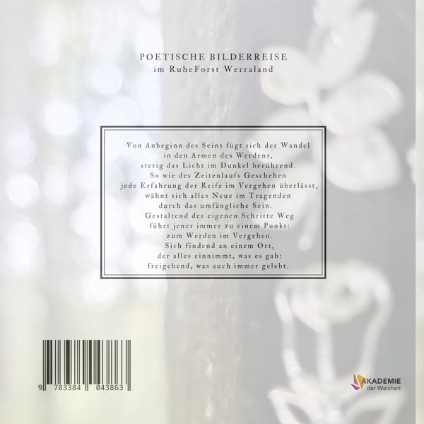 POETISCHE BILDERREISE in einem Ruheforst Von Anbeginn des Seins fügt sich der Wandel in den Armen des Werdens, stetig das Licht im Dunkel berührend. So wie des Zeitenlaufs Geschehen jede Erfahrung der Reife im Vergehen überlässt, wähnt sich alles Neue im Tragenden durch das umfängliche Sein. Gestaltend der eigenen Schritte Weg führt jener immer zu einem Punkt: zum Werden im Vergehen. Sich findend an einem Ort, der alles einnimmt, was es gab: freigebend, was auch immer gelebt.