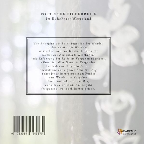 POETISCHE BILDERREISE in einem Ruheforst Von Anbeginn des Seins fügt sich der Wandel in den Armen des Werdens, stetig das Licht im Dunkel berührend. So wie des Zeitenlaufs Geschehen jede Erfahrung der Reife im Vergehen überlässt, wähnt sich alles Neue im Tragenden durch das umfängliche Sein. Gestaltend der eigenen Schritte Weg führt jener immer zu einem Punkt: zum Werden im Vergehen. Sich findend an einem Ort, der alles einnimmt, was es gab: freigebend, was auch immer gelebt.