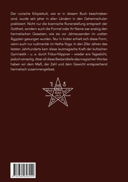 Der runische Körperkult, wie er in diesem Buch beschrieben wird, wurde seit jeher in allen Ländern in den Geheimschulen praktiziert. Nicht nur die kosmische Runenstellung entsprach der Gottheit, sondern auch die Formel oder ihr Name war analog den hermetischen Gesetzen, wie sie vor Jahrtausenden im uralten Ägypten gesungen wurden. Nur in Indien erhielt sich diese Form, wenn auch nur rudimentär im Hatha-Yoga. In den 20er Jahren des letzten Jahrhunderts kam diese lautmagische Kraft der kultischen Gymnastik - u. a. durch Fidus-Höppner - wieder ans Tageslicht, jedoch einseitig. Aber all diese Bestandteile des magischen Wortes haben wir dem Maß, der Zahl und dem Gewicht entsprechend hermetisch zusammengefasst.