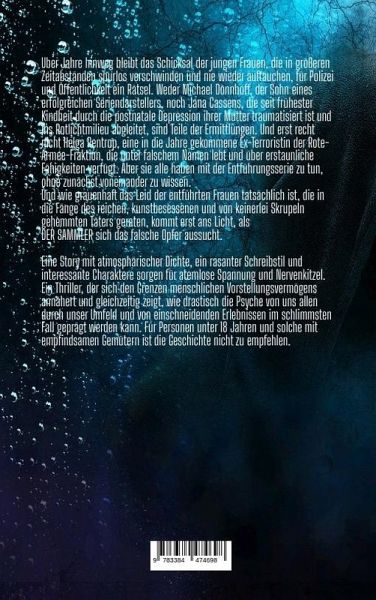 Harter Psychothriller mit expliziten Szenen. Entführung. Prostitution, Mystery.Über Jahre hinweg bleibt das Schicksal der jungen Frauen, die in größeren Zeitabständen spurlos verschwinden und nie wieder auftauchen, für Polizei und Öffentlichkeit ein Rätsel. Weder Michael Dönnhoff, der Sohn eines erfolgreichen Seriendarstellers, noch Jana Cassens, die seit frühester Kindheit durch die postnatale Depression ihrer Mutter traumatisiert ist und ins Rotlichtmilieu abgleitet, sind Teile der Ermittlungen. Und erst recht nicht Helga Rentrop, eine in die Jahre gekommene Ex-Terroristin der Rote-Armee-Fraktion, die unter falschem Namen lebt. Aber sie alle haben mit der Entführungsserie zu tun, ohne zunächst voneinander zu wissen.Und wie grauenhaft das Leid der entführten Frauen tatsächlich ist, die in die Fänge des reichen, kunstbesessenen und von keinerlei Skrupeln gehemmten Täters geraten, kommt erst ans Licht, als DER SAMMLER sich das falsche Opfer aussucht.Ein Thriller, der sich den Grenzen menschlichen Vorstellungsvermögens annähert und gleichzeitig zeigt, wie drastisch die Psyche von uns allen durch unser Umfeld und von einschneidenden Erlebnissen im schlimmsten Fall geprägt werden kann. Für Personen unter 18 Jahren und solche mit empfindsamen Gemütern ist die Geschichte nicht zu empfehlen.