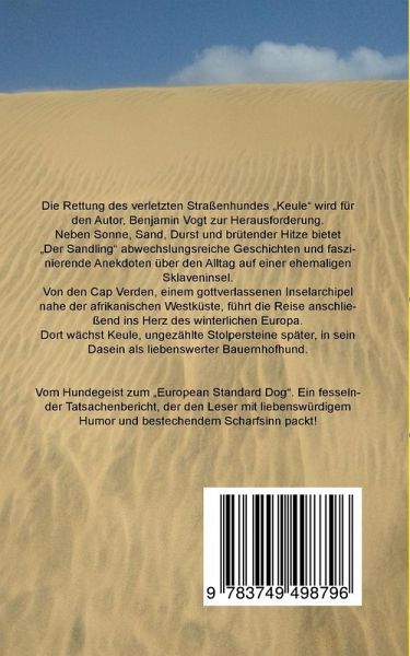Der erfolgreiche Autor Benjamin Vogt beschreibt die Rettung des verletzten Straßenhundes Keule.Neben Sonne, Sand, Durst und brütender Hitze bietet 'Der Sandling' abwechslungsreiche Geschichten und Anekdoten über den Alltag auf einer ehemaligen Sklaveninsel. Von den Cap Verden, einem gottverlassenen Inselarchipel nahe der afrikanischen Westküste, führt die Reise anschließend ins Herz des winterlichen Europa, nach Bayern. Dort wächst Keule, ungezählte Stolpersteine später, Schritt für Schritt in sein Dasein als liebenswerter Bauernhofhund.