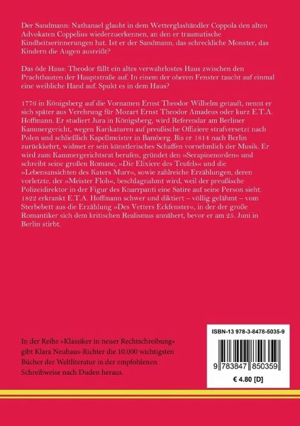 In der Reihe »Klassiker in neuer Rechtschreibung« gibt Klara Neuhaus-Richter die wichtigsten Bücher der Weltliteratur in der empfohlenen Schreibweise nach Duden heraus. E. T. A. Hoffmann: Der Sandmann / Das öde Haus. Zwei Nachtstücke Der Sandmann: Nathanael glaubt in dem Wetterglashändler Coppola den alten Advokaten Coppelius wiederzuerkennen, an den er traumatische Kindheitserinnerungen hat. Ist er der Sandmann, das schreckliche Monster, das Kindern die Augen ausreißt? Das öde Haus: Theodor fällt ein altes verwahrlostes Haus zwischen den Prachtbauten der Hauptstraße auf. In einem der oberen Fenster taucht auf einmal eine weibliche Hand auf. Spukt es in dem Haus? Der Sandmann: Erstdruck: Berlin, Reimer, 1816. Das öde Haus: Erstdruck: Berlin, Reimer, 1817. Textgrundlage ist die Ausgabe: E.T.A. Hoffmann: Poetische Werke in sechs Bänden, Band 2, Berlin: Aufbau, 1963. Die Paginierung obiger Ausgabe wird in dieser Neuausgabe als Marginalie zeilengenau mitgeführt. Neu herausgegeben und mit einer Biografie des Autors versehen von Klara Neuhaus-Richter, Berlin 2021. Umschlaggestaltung von Rainer Richter unter Verwendung einer Porträtzeichnung von Josefine Weinschrott. Gesetzt aus der Minion Pro, 11 pt. Henricus - Edition Deutsche Klassik GmbH Über den Autor: 1776 in Königsberg auf die Vornamen Ernst Theodor Wilhelm getauft, nennt er sich später aus Verehrung für Mozart Ernst Theodor Amadeus oder kurz E.T.A. Hoffmann. Er studiert Jura in Königsberg, wird Referendar am Berliner Kammergericht, wegen Karikaturen auf preußische Offiziere strafversetzt nach Polen und schließlich Kapellmeister in Bamberg. Bis er 1814 nach Berlin zurückkehrt, widmet er sein künstlerisches Schaffen vornehmlich der Musik. Er wird zum Kammergerichtsrat berufen, gründet den »Serapinenorden« und schreibt seine großen Romane, »Die Elixiere des Teufels« und die »Lebensansichten des Katers Murr«, sowie zahlreiche Erzählungen, deren vorletzte, der »Meister Floh«, beschlagnahmt wird, weil der preußische Polizeidirektor in der Figur des Knarrpanti eine Satire auf seine Person sieht. 1822 erkrankt E.T.A. Hoffmann schwer und diktiert ¿ völlig gelähmt ¿ vom Sterbebett aus die Erzählung »Des Vetters Eckfenster«, in der der große Romantiker sich dem kritischen Realismus annähert, bevor er am 25. Juni in Berlin stirbt.