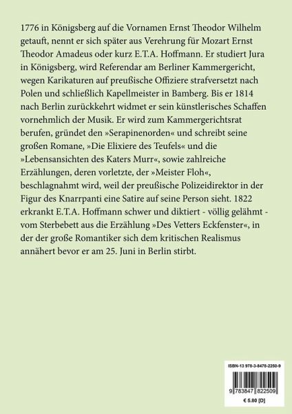 E. T. A. Hoffmann: Der Sandmann Lesefreundlicher Großdruck in 16-pt-Schrift Großformat, 210 x 297 mm Berliner Ausgabe, 2019 Durchgesehener Neusatz mit einer Biographie des Autors bearbeitet und eingerichtet von Theodor Borken Entstanden 1814¿1817, Erstdruck: Berlin (Reimer) 1817. Neuausgabe mit einer Biographie des Autors. Großformat, 210 x 297 mm Herausgegeben von Theodor Borken. Berlin 2019. Textgrundlage ist die Ausgabe: E.T.A. Hoffmann: Poetische Werke in sechs Bänden, Band 2, Berlin: Aufbau, 1963. Umschlaggestaltung von Thomas Schultz-Overhage unter Verwendung des Bildes: Johann Heinrich Füssli, Nachtmahr, 1802. Gesetzt aus der Minion Pro, 16 pt. Henricus Edition Deutsche Klassik UG (haftungsbeschränkt) Über den Autor: 1776 in Königsberg auf die Vornamen Ernst Theodor Wilhelm getauft, nennt er sich später aus Verehrung für Mozart Ernst Theodor Amadeus oder kurz E.T.A. Hoffmann. Er studiert Jura in Königsberg, wird Referendar am Berliner Kammergericht, wegen Karikaturen auf preußische Offiziere strafversetzt nach Polen und schließlich Kapellmeister in Bamberg. Bis er 1814 nach Berlin zurückkehrt widmet er sein künstlerisches Schaffen vornehmlich der Musik. Er wird zum Kammergerichtsrat berufen, gründet den »Serapinenorden« und schreibt seine großen Romane, »Die Elixiere des Teufels« und die »Lebensansichten des Katers Murr«, sowie zahlreiche Erzählungen, deren vorletzte, der »Meister Floh«, beschlagnahmt wird, weil der preußische Polizeidirektor in der Figur des Knarrpanti eine Satire auf seine Person sieht. 1822 erkrankt E.T.A. Hoffmann schwer und diktiert - völlig gelähmt - vom Sterbebett aus die Erzählung »Des Vetters Eckfenster«, in der der große Romantiker sich dem kritischen Realismus annähert bevor er am 25. Juni in Berlin stirbt.