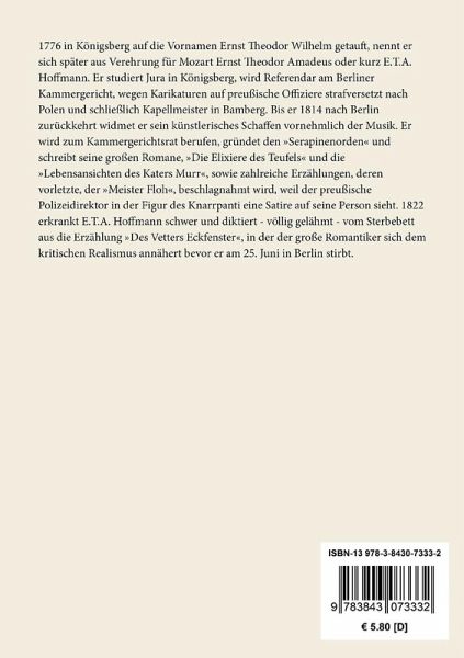 E. T. A. Hoffmann: Der Sandmann Entstanden 1814¿1817, Erstdruck: Berlin (Reimer) 1817. Vollständige Neuausgabe mit einer Biographie des Autors. Herausgegeben von Karl-Maria Guth. Berlin 2015. Textgrundlage ist die Ausgabe: E.T.A. Hoffmann: Poetische Werke in sechs Bänden, Band 2, Berlin: Aufbau, 1963. Die Paginierung obiger Ausgabe wird in dieser Neuausgabe als Marginalie zeilengenau mitgeführt. Umschlaggestaltung von Thomas Schultz-Overhage unter Verwendung des Bildes: E.T.A. Hoffmann, Der Sandmann, 1817. Gesetzt aus Minion Pro, 11 pt. Über den Autor: 1776 in Königsberg auf die Vornamen Ernst Theodor Wilhelm getauft, nennt er sich später aus Verehrung für Mozart Ernst Theodor Amadeus oder kurz E.T.A. Hoffmann. Er studiert Jura in Königsberg, wird Referendar am Berliner Kammergericht, wegen Karikaturen auf preußische Offiziere strafversetzt nach Polen und schließlich Kapellmeister in Bamberg. Bis er 1814 nach Berlin zurückkehrt widmet er sein künstlerisches Schaffen vornehmlich der Musik. Er wird zum Kammergerichtsrat berufen, gründet den »Serapinenorden« und schreibt seine großen Romane, »Die Elixiere des Teufels« und die »Lebensansichten des Katers Murr«, sowie zahlreiche Erzählungen, deren vorletzte, der »Meister Floh«, beschlagnahmt wird, weil der preußische Polizeidirektor in der Figur des Knarrpanti eine Satire auf seine Person sieht. 1822 erkrankt E.T.A. Hoffmann schwer und diktiert - völlig gelähmt - vom Sterbebett aus die Erzählung »Des Vetters Eckfenster«, in der der große Romantiker sich dem kritischen Realismus annähert bevor er am 25. Juni in Berlin stirbt.