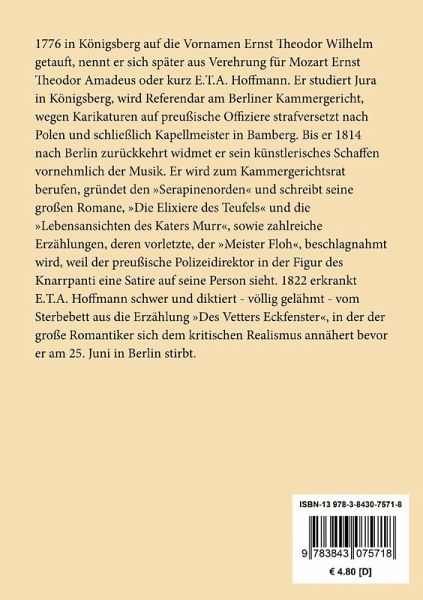 E. T. A. Hoffmann: Der Sandmann Entstanden 1814¿1817, Erstdruck: Berlin (Reimer) 1817. Vollständige Neuausgabe mit einer Biographie des Autors. Herausgegeben von Karl-Maria Guth. Berlin 2015, 2. Auflage. Textgrundlage ist die Ausgabe: E.T.A. Hoffmann: Poetische Werke in sechs Bänden, Band 2, Berlin: Aufbau, 1963. Die Paginierung obiger Ausgabe wird in dieser Neuausgabe als Marginalie zeilengenau mitgeführt. Umschlaggestaltung von Thomas Schultz-Overhage unter Verwendung des Bildes: E.T.A. Hoffmann, Der Sandmann, 1817. Gesetzt aus Minion Pro, 11 pt. Über den Autor: 1776 in Königsberg auf die Vornamen Ernst Theodor Wilhelm getauft, nennt er sich später aus Verehrung für Mozart Ernst Theodor Amadeus oder kurz E.T.A. Hoffmann. Er studiert Jura in Königsberg, wird Referendar am Berliner Kammergericht, wegen Karikaturen auf preußische Offiziere strafversetzt nach Polen und schließlich Kapellmeister in Bamberg. Bis er 1814 nach Berlin zurückkehrt widmet er sein künstlerisches Schaffen vornehmlich der Musik. Er wird zum Kammergerichtsrat berufen, gründet den »Serapinenorden« und schreibt seine großen Romane, »Die Elixiere des Teufels« und die »Lebensansichten des Katers Murr«, sowie zahlreiche Erzählungen, deren vorletzte, der »Meister Floh«, beschlagnahmt wird, weil der preußische Polizeidirektor in der Figur des Knarrpanti eine Satire auf seine Person sieht. 1822 erkrankt E.T.A. Hoffmann schwer und diktiert - völlig gelähmt - vom Sterbebett aus die Erzählung »Des Vetters Eckfenster«, in der der große Romantiker sich dem kritischen Realismus annähert bevor er am 25. Juni in Berlin stirbt.