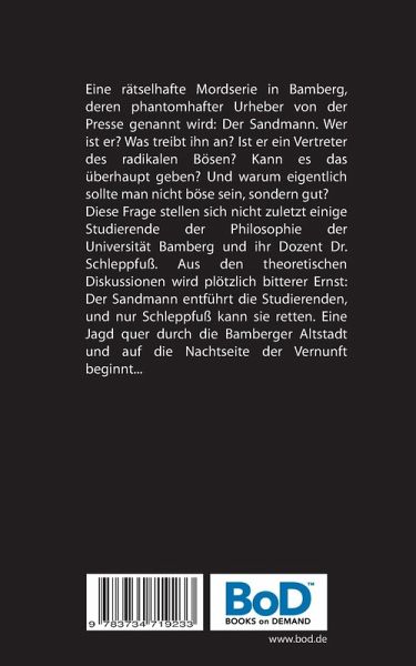 Eine rätselhafte Mordserie in Bamberg, deren phantomhafter Urheber von der Presse genannt wird: Der Sandmann. Wer ist er? Was treibt ihn an? Ist er ein Vertreter des radikalen Bösen? Kann es das überhaupt geben? Und warum eigentlich sollte man nicht böse sein, sondern gut?Diese Frage stellen sich nicht zuletzt einige Studierende der Philosophie der Universität Bamberg und ihr Dozent Dr. Schleppfuß. Aus den theoretischen Diskussionen wird plötzlich bitterer Ernst: Der Sandmann entführt die Studierenden, und nur Schleppfuß kann sie retten. Eine Jagd quer durch die Bamberger Altstadt und auf die Nachtseite der Vernunft beginnt...