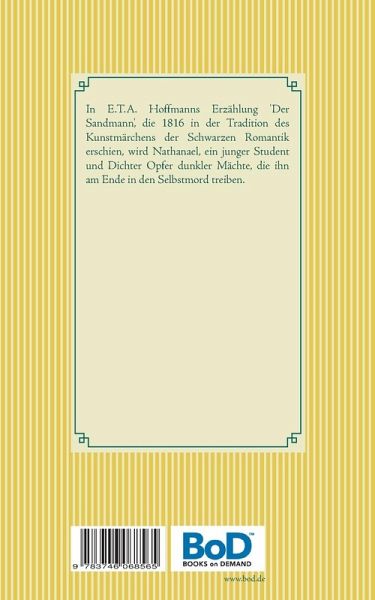 In E.T.A. Hoffmanns Erzählung 'Der Sandmann', die 1816 in der Tradition des Kunstmärchens der Schwarzen Romantik erschien, wird Nathanael, ein junger Student und Dichter, Opfer dunkler Mächte, die ihn am Ende in den Selbstmord treiben.