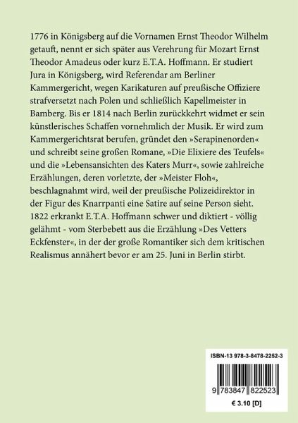 E. T. A. Hoffmann: Der Sandmann Taschenbuch Berliner Ausgabe, 2019 Durchgesehener Neusatz bearbeitet und eingerichtet von Theodor Borken Entstanden 1814¿1817, Erstdruck: Berlin (Reimer) 1817. Neuausgabe. Herausgegeben von Theodor Borken. Berlin 2019. Textgrundlage ist die Ausgabe: E.T.A. Hoffmann: Poetische Werke in sechs Bänden, Band 2, Berlin: Aufbau, 1963. Die Paginierung obiger Ausgabe wird in dieser Neuausgabe als Marginalie zeilengenau mitgeführt. Umschlaggestaltung von Thomas Schultz-Overhage unter Verwendung des Bildes: Johann Heinrich Füssli, Nachtmahr, 1802. Gesetzt aus der Minion Pro, 11 pt. Henricus Edition Deutsche Klassik UG (haftungsbeschränkt) Über den Autor: 1776 in Königsberg auf die Vornamen Ernst Theodor Wilhelm getauft, nennt er sich später aus Verehrung für Mozart Ernst Theodor Amadeus oder kurz E.T.A. Hoffmann. Er studiert Jura in Königsberg, wird Referendar am Berliner Kammergericht, wegen Karikaturen auf preußische Offiziere strafversetzt nach Polen und schließlich Kapellmeister in Bamberg. Bis er 1814 nach Berlin zurückkehrt widmet er sein künstlerisches Schaffen vornehmlich der Musik. Er wird zum Kammergerichtsrat berufen, gründet den »Serapinenorden« und schreibt seine großen Romane, »Die Elixiere des Teufels« und die »Lebensansichten des Katers Murr«, sowie zahlreiche Erzählungen, deren vorletzte, der »Meister Floh«, beschlagnahmt wird, weil der preußische Polizeidirektor in der Figur des Knarrpanti eine Satire auf seine Person sieht. 1822 erkrankt E.T.A. Hoffmann schwer und diktiert - völlig gelähmt - vom Sterbebett aus die Erzählung »Des Vetters Eckfenster«, in der der große Romantiker sich dem kritischen Realismus annähert bevor er am 25. Juni in Berlin stirbt.