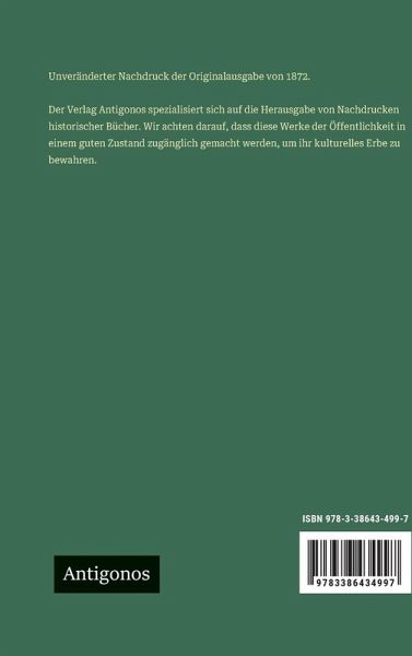 Unveränderter Nachdruck der Originalausgabe von 1872. Der Verlag Antigonos spezialisiert sich auf die Herausgabe von Nachdrucken historischer Bücher. Wir achten darauf, dass diese Werke der Öffentlichkeit in einem guten Zustand zugänglich gemacht werden, um ihr kulturelles Erbe zu bewahren.