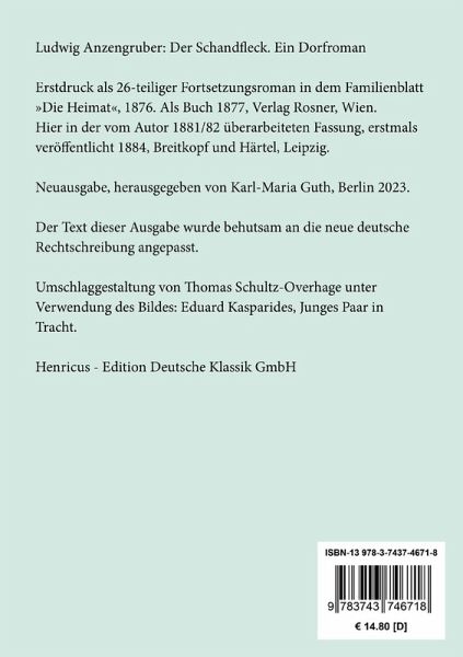 Ludwig Anzengruber: Der Schandfleck. Ein DorfromanErstdruck als 26-teiliger Fortsetzungsroman in dem Familienblatt »Die Heimat«, 1876. Als Buch 1877, Verlag Rosner, Wien. Hier in der vom Autor 1881/82 überarbeiteten Fassung, erstmals veröffentlicht 1884, Breitkopf und Härtel, Leipzig.Neuausgabe, herausgegeben von Karl-Maria Guth, Berlin 2023.Der Text dieser Ausgabe wurde behutsam an die neue deutsche Rechtschreibung angepasst.Umschlagabbildung: Eduard Kasparides, Junges Paar in TrachtGesetzt aus der Minion Pro, 11 pt.Die Sammlung Hofenberg erscheint im Verlag Henricus - Edition Deutsche Klassik GmbH, BerlinÜber den Autor:1839 in Wien als Sohn eines kleinen Beamten mit künstlerischen Ambitionen geboren, muss Ludwig Anzengruber nach dem frühen Tod des Vaters die Realschule aus wirtschaftlicher Not verlassen. Nach einer abgebrochenen Buchhändlerlehre beschließt er, Schauspieler zu werden und tingelt zehn Jahre lang als Statist durch Österreich, Kroatien und Ungarn und landet schließlich 1866 in Wien mit kleineren Engagements; daneben beginnt er zu schreiben. 1870 wird er mit der Uraufführung seines Stückes »Der Pfarrer von Kirchfeld« schlagartig bekannt. Nachfolgende Stücke sind nicht nachhaltig erfolgreich und er versucht sich mit Prosawerken und arbeitet als Journalist. 1888 wird er Dramaturg am Deutschen Volkstheater in Wien. Am 10. Dezember 1889 stirbt mit Ludwig Anzengruber ein bekannter österreichischer Schriftsteller des ausgehenden Realismus an einer Blutvergiftung.