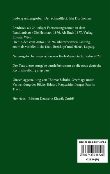 Ludwig Anzengruber: Der Schandfleck. Ein DorfromanErstdruck als 26-teiliger Fortsetzungsroman in dem Familienblatt »Die Heimat«, 1876. Als Buch 1877, Verlag Rosner, Wien. Hier in der vom Autor 1881/82 überarbeiteten Fassung, erstmals veröffentlicht 1884, Breitkopf und Härtel, Leipzig.Neuausgabe, herausgegeben von Karl-Maria Guth, Berlin 2023.Der Text dieser Ausgabe wurde behutsam an die neue deutsche Rechtschreibung angepasst.Umschlagabbildung: Eduard Kasparides, Junges Paar in TrachtGesetzt aus der Minion Pro, 11 pt.Die Sammlung Hofenberg erscheint im Verlag Henricus - Edition Deutsche Klassik GmbH, BerlinÜber den Autor:1839 in Wien als Sohn eines kleinen Beamten mit künstlerischen Ambitionen geboren, muss Ludwig Anzengruber nach dem frühen Tod des Vaters die Realschule aus wirtschaftlicher Not verlassen. Nach einer abgebrochenen Buchhändlerlehre beschließt er, Schauspieler zu werden und tingelt zehn Jahre lang als Statist durch Österreich, Kroatien und Ungarn und landet schließlich 1866 in Wien mit kleineren Engagements; daneben beginnt er zu schreiben. 1870 wird er mit der Uraufführung seines Stückes »Der Pfarrer von Kirchfeld« schlagartig bekannt. Nachfolgende Stücke sind nicht nachhaltig erfolgreich und er versucht sich mit Prosawerken und arbeitet als Journalist. 1888 wird er Dramaturg am Deutschen Volkstheater in Wien. Am 10. Dezember 1889 stirbt mit Ludwig Anzengruber ein bekannter österreichischer Schriftsteller des ausgehenden Realismus an einer Blutvergiftung.