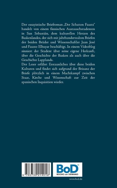 Der essayistische Briefroman "Der Schatten Fausts" handelt von einem finnischen Austauschstudenten in San Sebastián, dem kulturellen Herzen des Baskenlandes, der sich mit jahrhundertealten Briefen der beiden Brüder und Wissenschaftler Juan José und Fausto Elhuyar beschäftigt. In einem Videoblog sinniert der Student über seine eigene Herkunft, über die Geschichte der Basken als auch über die Geschichte Lapplands.Der Leser erfährt Erstaunliches über diese beiden Kulturen und findet sich aufgrund der Brisanz der Briefe plötzlich in einem Machtkampf zwischen Staat, Kirche und Wissenschaft zur Zeit der spanischen Inquisition wieder.