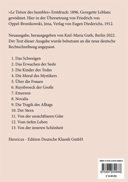 Maurice Maeterlinck: Der Schatz der Armen. Dreizehn tiefgründig-mystische Essays des belgischen Literaturnobelpreisträgers Lesefreundlicher Großdruck in 16-pt-Schrift Großformat, 210 x 297 mm Berliner Ausgabe, 2023 Durchgesehener Neusatz bearbeitet und eingerichtet von Theodor Borken »Le Trésor des humbles« Erstdruck: 1896, Georgette Leblanc gewidmet. Hier in der Übersetzung von Friedrich von Oppel-Bronikowski, Jena, Verlag von Eugen Diederichs, 1912. Inhaltsverzeichnis: Der Schatz der Armen. 1. Das Schweigen. 2. Das Erwachen der Seele. 3. Die Kinder des Todes. 4. Die Moral des Mystikers. 5. Über die Frauen. 6. Ruysbroeck der Große. 7. Emerson. 8. Novalis. 9. Die Tragik des Alltags. 10. Der Stern. 11. Von der unsichtbaren Güte. 12. Vom tiefen Leben. 13. Von der inneren Schönheit. Anmerkungen des Übersetzers. Der Text dieser Ausgabe wurde behutsam an die neue deutsche Rechtschreibung angepasst. Umschlaggestaltung von Thomas Schultz-Overhage unter Verwendung des Bildes: Maurice Maeterlinck, vor 1903. Gesetzt aus der Minion Pro, 16 pt. Henricus - Edition Deutsche Klassik GmbH