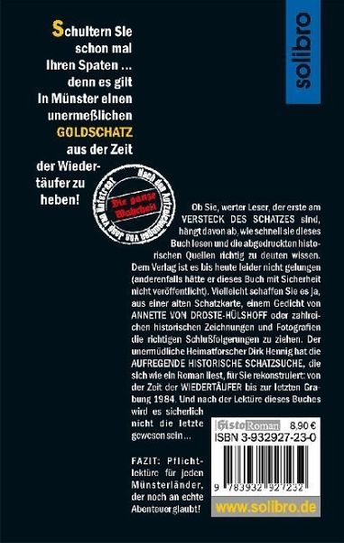 Das Buch Im Jahr 2000 bekam der Heimatforscher und Autor Dirk Hennig die erstmalige Gelegenheit, das Archiv des renommierten Historikers Dr. Jaap van Hoofstraat einzusehen. Als er dabei auf die Geschichte Hinrich von Hagens und seines unermeßlichen Schatzes im münsterischen Aasee traf, begann er die von van Hoofstraat zusammengetragenen Fakten an den Originalschauplätzen zu rekonstruieren. Aus Tagebüchern und Aufzeichnungen des ehemaligen Geschichtsprofessors trug der unermüdliche Hennig die aufregende Dokumentation um den münsterischen Kaufmann Hinrich von Hagen zusammen, der in den Wirren der Wiedertäuferzeit im 16. Jahrhundert seine hart erarbeiteten Reichtümer vor den Wiedertäufern so gut versteckt hat, daß sie trotz zahlreicher Grabungen im Laufe der Jahrhunderte bis heute nicht gefunden wurden. Das vorliegende Buch beinhaltet die erstmalige Zusammenstellung sämtlicher Forschungsergebnisse der bisher wenig bekannten Schatzsuche in der westfälischen Metropole. Dabei liest sich die lebendige Dokumentation wie ein Roman. Allein schon bei der Lektüre der im Buch komplett abgedruckten, weitgehend unbekannten Erzählung "Eine verhängnisvolle Nacht" von Karl-Maria Sternbach (1927) taucht der Leser ein in die Zeit der Wiedertäufer, als sei er selbst dabei gewesen. Deshalb wendet sich dieses Buch eben auch nicht nur an Historiker und Heimatforscher sondern auch an jeden Münsteraner, der ein spannendes Buch lesen und dabei auch noch Erhellendes über seine Heimatgeschichte erfahren möchte. Schließlich möchte man ja mitreden können. Obzwar dieses Buch auf kurzweilige Weise unterhält, wurde jedoch darauf geachtet, die historischen Fakten korrekt wiederzugeben. So findet der Leser z.B. die Reproduktion der authentischen Schatzkarte von 1534, zahlreiche historische Fotografien und weitere historische Quellen. Auch ein Gedicht von Annette von Droste Hülshoff spielt eine entscheidende Rolle auf dem Weg von den Anfängen zur Zeit der Wiedertäufer im 16. Jahrhundertbis zur bisher letzten Grabung 1984. Ob es nach der Lektüre dieses Buches die letzte gewesen sein wird? Fazit: Pflichtlektüre für jeden Münsterländer, der noch an Abenteuer glaubt. "In der unbeschwerten Phantasie der Kindheit entsteht mancher Traum von versunkenen Schätzen aus vergangenen Zeiten. Der erwachende Geist hindert die meisten, an diesen Wunschbildern festzuhalten. Doch in einigen Menschen verharrt die Vorstellung, als Abenteurer durch die Lande zu ziehen und einer Karte zu folgen, die Gold, Silber oder Diamanten verspricht. 'Verlorene Schätze, das sind unvergessliche Geschichten von der Jagd nach dem Glück auf Erden.'" (Dirk Hennig)