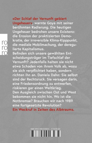 Sind die von uns gewählten Entscheidungsträger in einen Tiefschlaf der Vernunft gefallen? Jedenfalls halten sie nicht hinreichend Schaden von ihrem Volk ab, wozu sie sich verpflichtet haben. Sie versagen darin, eine Friedensordnung zu gewährleisten, das Kippen des Klimas zu verhindern, Fluchtursachen zu bekämpfen. Sie gehen ein Weltkriegsrisiko ein. Und nicht einmal den Ausgleich zwischen Ost und West bekommen sie hin. Daniela Dahn: Sie selbst sind der Rechtsruck.