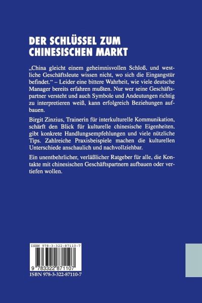 I: Kultur - Geschichte - Philosophie.- 1. Geschichtlicher Abriß.- 2. China - eine Gesellschaft im Umbruch.- 3. Konfuzianismus.- 4. Westliche und östliche Denkweise.- 5. Der Fremde - der Barbar.- 6. Kiautschou - ein deutscher Irrweg.- 7. Nord-Süd-Gefälle.- 8. Heimatverbundenheit - Patriotismus.- 9. Die gelbe Rasse.- II: Mentalität - Traditionen - Riten.- 1. Das Gesicht.- 2. Die danwei.- 3. Neue Lebensqualität in den Städten.- 4. Die Familie.- 5. Alter.- 6. Zeitrechnung und Feiertage.- 7. Freizeit.- 8. Die chinesische Küche.- 9. Fengshui.- III: To Dos und Tabus in China.- 1. Namen und Anrede.- 2. Begrüßung.- 3. Gesprächsthemen.- 4. Sprache.- 5. Firmennamen auf chinesisch.- 6. Zahlen.- 7. Körpersprache.- 8. Geschenke.- 9. Farben.- 10. Privatsphäre.- 11. Bankette - Einladungen - Trinksprüche - Sitzordnungen - Delegationseinladungen.- 12. Zeit.- IV: Verhandlungsführung.- 1. Bürokratie.- 2. Verhandlungen.- 3. Empfang chinesischer Delegationen.- 4. Kommunikationsstruktur.- 5. Konflikt.- Schluß.- Die Autorin.