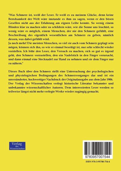 Dieses Buch über den Schmerz stellt eine Untersuchung der psychologischen und physiologischen Bedingungen des Schmerzvorganges dar und ist ein unveränderter, hochwertiger Nachdruck der Originalausgabe aus dem Jahr 1906.