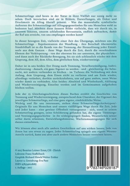 Schmetterlinge sind heute in der Natur in ihrer Vielfalt nur wenig mehr zu sehen. Doch inzwischen sind sie in Bildern, Darstellungen, als Dekor und Druckmotiv im Alltag überall präsent. - Was das massenhafte symbolische Auftreten des Schmetterlings auf Alltagsgegenständen für uns Menschen wohl zu bedeuten hat? Möchten diese Bilder vielleicht äußern, dass wir durch sie, in unserem Inneren, unserm schlafenden Bewusstsein, endlich aufwachen, damit ihr Ruf uns erreicht, von uns empfangen werden kann?In dieser bewegten Zeit, vielleicht einer Zeit des Übergangs, möchten uns die Schmetterlinge - Repräsentanten der Wandlung - ihre Botschaft übermitteln: Sinnbildhaft ist es die Kunde von der Trennung, der Herauslösung jeder Einzelseele aus dem Ganzen - ihrer Wege durch die Zeit, durch die verschiedenen Ebenen der Verkörperung - von der obersten bis zur untersten, der physischen - und dann auch der Rückkehr-Bewegung, bis sie sich schließlich wieder mit dem Ursprung, dem All, dem Alles, demgöttlichen Sein, wiedervereinigt.Daher ist in uns beides: Der Drang nach Trennung, Verselbstständigung, Individualisierung - danach, ein ganz Eigener zu werden - und - gleichzeitig: die Sehnsucht, mit anderen verbunden zu bleiben - im Tiefsten: die Verbindung mit dem Anfang, dem Ursprung, dem Einen nicht zu verlieren und am Ende wieder, allerdings verändert, dorthin zurückzukehren, uns auf ganz andere, neue Weise wieder damit zu verbinden. Also beides: Abschied und Wiederkunft, Ablösung und Wiedervereinigung, Einzelne werden und im Gemeinsamen aufgehoben bleiben wollen.Jede der 25 Gleichnisgeschichten dieses Buches erzählt die Geschichte von Trennung und Wiedervereinigung, entsprechend dem Charakter, der Eigenart des jeweiligen Schmetterlings, auf eine ganz eigene, eindrückliche Weise.Wichtig und für uns interessant, stehen diese Schmetterlings-Archetypen, -Originale für uns Menschen und unsere vielfältigen Wege durch die Zeit. Jede und Jeder kann - eine gewisse Offenheit vorausgesetzt - sich, wenn er seinen Schmetterling gezogen, seine Schilderung gefunden hat, die eigene Trennungs- und Vereinigungsgeschichte in ihr widergespiegelt finden, Wesentliches seiner selbst darin erkennen, Entwicklungshinweise, Wachstumsanregungen für sich daraus entnehmen. Wir können aber auch alle andern Geschichten auf uns wirken lassen. Jede von ihnen hat uns etwas zu sagen.