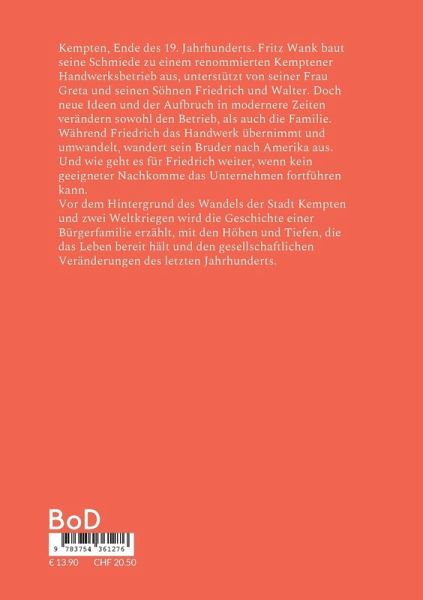 Kempten, Ende des 19. Jahrhunderts. Fritz Wank baut seine Schmiede zu einem renommierten Kemptener Handwerksbetrieb aus, unterstützt von seiner Frau Greta und seinen Söhnen Friedrich und Walter. Doch neue Ideen und der Aufbruch in modernere Zeiten verändern sowohl den Betrieb, als auch die Familie. Während Friedrich das Handwerk übernimmt und umwandelt, wandert sein Bruder nach Amerika aus. Und wie geht es für Friedrich weiter, wenn kein geeigneter Nachkomme das Unternehmen fortführen kann. Vor dem Hintergrund des Wandels der Stadt Kempten und zwei Weltkriegen wird die Geschichte einer Bürgerfamilie erzählt, mit den Höhen und Tiefen, die das Leben bereit hält und den gesellschaftlichen Veränderungen des letzten Jahrhunderts.