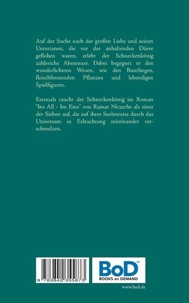 Auf der Suche nach der großen Liebe und seinen Untertanen, die vor der anhaltenden Dürre geflohen waren, erlebt der Schneckenkönig zahlreiche Abenteuer und begegnet den wunderlichsten Wesen, wie den Buntlingen und lebendigen Spielfiguren. Erstmals taucht der Schneckenkönig im Roman "Ins All - Im Eins" von Rainar Nitzsche als einer der sieben auf, die auf ihrer Seelenreise durch das Universum in Erleuchtung miteinander verschmelzen.