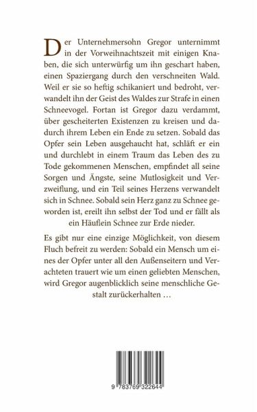 Der Unternehmersohn Gregor unternimmt in der Vorweihnachtszeit mit einigen Knaben, die sich unterwürfig um ihn geschart haben, einen Spaziergang durch den verschneiten Wald. Weil er sie so heftig schikaniert und bedroht, verwandelt ihn der Geist des Waldes zur Strafe in einen Schneevogel. Fortan ist Gregor dazu verdammt, über gescheiterten Existenzen zu kreisen und dadurch ihrem Leben ein Ende zu setzen. Sobald das Opfer sein Leben ausgehaucht hat, schläft er ein und durchlebt in einem Traum das Leben des zu Tode gekommenen Menschen, empfindet all seine Sorgen und Ängste, seine Mutlosigkeit und Verzweiflung, und ein Teil seines Herzens verwandelt sich in Schnee. Sobald sein Herz ganz zu Schnee geworden ist, ereilt ihn selbst der Tod und er fällt als ein Häuflein Schnee zur Erde nieder. Es gibt nur eine einzige Möglichkeit, von diesem Fluch befreit zu werden: Sobald ein Mensch um eines der Opfer unter all den Außenseitern und Verachteten trauert wie um einen geliebten Menschen, wird Gregor augenblicklich seine menschliche Gestalt zurückerhalten ...