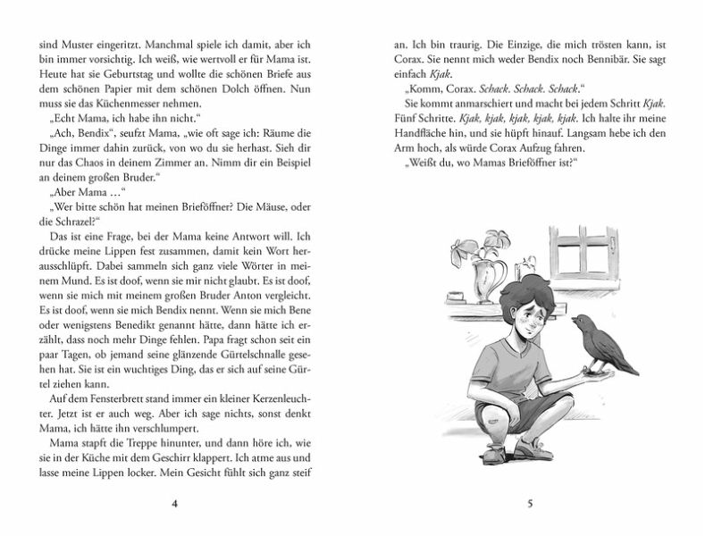 Wer steckt hinter den geheimnisvollen Diebstählen? Im idyllischen Bergdorf Oberau verschwinden immer wieder glänzende Gegenstände. Bene, seine beste Freundin Leni und sein Bruder Anton machen sich, gemeinsam mit der Dohle Corax auf die Suche nach dem Dieb. Viele der Erwachsenen verdächtigen Walburga, die am Waldrand lebt und nicht so richtig in die Dorfgemeinschaft zu passen scheint. Doch die Freunde sind sich sicher, dass die Vorurteile falsch sind, denn sie merken schnell: Es gibt immer mehr, als man auf den ersten Blick sieht. Während ihrer spannenden Suche entdecken sie nicht nur alte Geheimnisse, sondern auch das traditionelle Handwerk der Köhlerei. Plötzlich gerät Leni in große Gefahr und ein Verdächtiger scheint gefunden. Doch dann kommt alles anders als gedacht. Können die Freunde es gemeinsam schaffen, den Täter zu stellen? Und welche Rolle spielen dabei die geheimnisvollen Schrazellöcher?Um das herauszufinden, müssen sie mutig sein, Vorurteile überwinden und lernen, umHilfe zu bitten. Ein spannender Kinderkrimi ab 9 Jahren, über Zusammenhalt, (Gott-)Vertrauen und den Mut, sich den eigenen Ängsten zu stellen.
