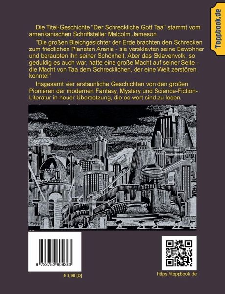 Die Titel-Geschichte "Der Schreckliche Gott Taa" stammt vom amerikanischen Schriftsteller Malcolm Jameson. "Die großen Bleichgesichter der Erde brachten den Schrecken zum friedlichen Planeten Arania - sie versklavten seine Bewohner und beraubten ihn seiner Schönheit. Aber das Sklavenvolk, so geduldig es auch war, hatte eine große Macht auf seiner Seite - die Macht von Taa dem Schrecklichen, der eine Welt zerstören konnte!"Insgesamt vier erstaunliche Geschichten von den großen Pionieren der modernen Fantasy, Mystery und Science-Fiction-Literatur in neuer Übersetzung, die es wert sind zu lesen.