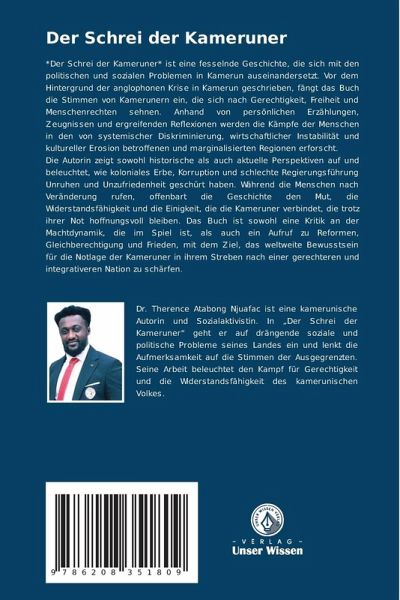 _Der Schrei der Kameruner_ ist eine fesselnde Geschichte, die sich mit den politischen und sozialen Problemen in Kamerun auseinandersetzt. Vor dem Hintergrund der anglophonen Krise in Kamerun geschrieben, fängt das Buch die Stimmen von Kamerunern ein, die sich nach Gerechtigkeit, Freiheit und Menschenrechten sehnen. Anhand von persönlichen Erzählungen, Zeugnissen und ergreifenden Reflexionen werden die Kämpfe der Menschen in den von systemischer Diskriminierung, wirtschaftlicher Instabilität und kultureller Erosion betroffenen und marginalisierten Regionen erforscht.Die Autorin zeigt sowohl historische als auch aktuelle Perspektiven auf und beleuchtet, wie koloniales Erbe, Korruption und schlechte Regierungsführung Unruhen und Unzufriedenheit geschürt haben. Während die Menschen nach Veränderung rufen, offenbart die Geschichte den Mut, die Widerstandsfähigkeit und die Einigkeit, die die Kameruner verbindet, die trotz ihrer Not hoffnungsvoll bleiben. Das Buch ist sowohl eine Kritik an der Machtdynamik, die im Spiel ist, als auch ein Aufruf zu Reformen, Gleichberechtigung und Frieden, mit dem Ziel, das weltweite Bewusstsein für die Notlage der Kameruner in ihrem Streben nach einer gerechteren und integrativeren Nation zu schärfen.