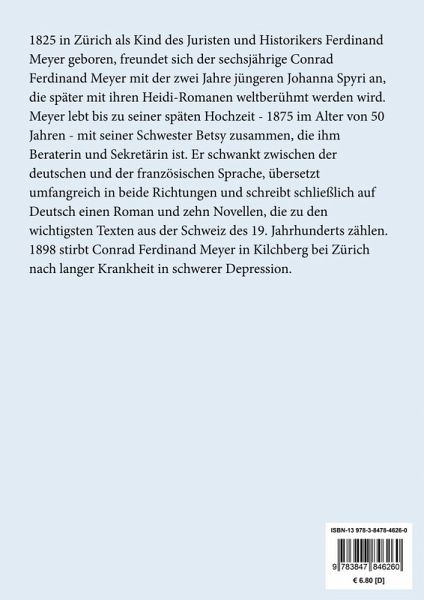 Conrad Ferdinand Meyer: Der Schuß von der Kanzel Lesefreundlicher Großdruck in 16-pt-Schrift Großformat, 210 x 297 mm Berliner Ausgabe, 2020 Durchgesehener Neusatz mit einer Biographie des Autors bearbeitet und eingerichtet von Theodor Borken Erstdruck in: Zürcher Taschenbuch auf das Jahr 1878, Zürich 1877. Textgrundlage ist die Ausgabe: Conrad Ferdinand Meyer: Sämtliche Werke in zwei Bänden. Vollständiger Text nach den Ausgaben letzter Hand. Mit einem Nachwort von Erwin Laaths, München: Winkler, 1968. Umschlaggestaltung von Thomas Schultz-Overhage unter Verwendung des Bildes: Ferdinand Hodler, Der Pastor, 1879. Gesetzt aus der Minion Pro, 16 pt. Henricus Edition Deutsche Klassik UG (haftungsbeschränkt) Über den Autor: 1825 in Zürich als Kind des Juristen und Historikers Ferdinand Meyer geboren, freundet sich der sechsjährige Conrad Ferdinand Meyer mit der zwei Jahre jüngeren Johanna Spyri an, die später mit ihren Heidi-Romanen weltberühmt werden wird. Meyer lebt bis zu seiner späten Hochzeit - 1875 im Alter von 50 Jahren - mit seiner Schwester Betsy zusammen, die ihm Beraterin und Sekretärin ist. Er schwankt zwischen der deutschen und der französischen Sprache, übersetzt umfangreich in beide Richtungen und schreibt schließlich auf Deutsch einen Roman und zehn Novellen, die zu den wichtigsten Texten aus der Schweiz des 19. Jahrhunderts zählen. 1898 stirbt Conrad Ferdinand Meyer in Kilchberg bei Zürich nach langer Krankheit in schwerer Depression.