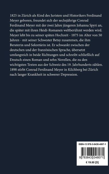 Conrad Ferdinand Meyer: Der Schuß von der Kanzel Erstdruck in: Zürcher Taschenbuch auf das Jahr 1878, Zürich 1877. Vollständige Neuausgabe mit einer Biographie des Autors. Herausgegeben von Karl-Maria Guth. Berlin 2014. Textgrundlage ist die Ausgabe: Conrad Ferdinand Meyer: Sämtliche Werke in zwei Bänden. Vollständiger Text nach den Ausgaben letzter Hand. Mit einem Nachwort von Erwin Laaths, München: Winkler, 1968. Die Paginierung obiger Ausgabe wird in dieser Neuausgabe als Marginalie zeilengenau mitgeführt. Umschlaggestaltung von Thomas Schultz-Overhage unter Verwendung des Bildes: Ferdinand Hodler, Der Pastor, 1879. Gesetzt aus Minion Pro, 11 pt. Über den Autor: 1825 in Zürich als Kind des Juristen und Historikers Ferdinand Meyer geboren, freundet sich der sechsjährige Conrad Ferdinand Meyer mit der zwei Jahre jüngeren Johanna Spyri an, die später mit ihren Heidi-Romanen weltberühmt werden wird. Meyer lebt bis zu seiner späten Hochzeit - 1875 im Alter von 50 Jahren - mit seiner Schwester Betsy zusammen, die ihm Beraterin und Sekretärin ist. Er schwankt zwischen der deutschen und der französischen Sprache, übersetzt umfangreich in beide Richtungen und schreibt schließlich auf Deutsch einen Roman und zehn Novellen, die zu den wichtigsten Texten aus der Schweiz des 19. Jahrhunderts zählen. 1898 stirbt Conrad Ferdinand Meyer in Kilchberg bei Zürich nach langer Krankheit in schwerer Depression.
