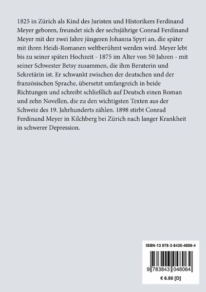 Conrad Ferdinand Meyer: Der Schuß von der Kanzel Erstdruck in: Zürcher Taschenbuch auf das Jahr 1878, Zürich 1877. Vollständige Neuausgabe mit einer Biographie des Autors. Herausgegeben von Karl-Maria Guth. Berlin 2014. Textgrundlage ist die Ausgabe: Conrad Ferdinand Meyer: Sämtliche Werke in zwei Bänden. Vollständiger Text nach den Ausgaben letzter Hand. Mit einem Nachwort von Erwin Laaths, München: Winkler, 1968. Die Paginierung obiger Ausgabe wird in dieser Neuausgabe als Marginalie zeilengenau mitgeführt. Umschlaggestaltung von Thomas Schultz-Overhage unter Verwendung des Bildes: Ferdinand Hodler, Der Pastor, 1879. Gesetzt aus Minion Pro, 11 pt. Über den Autor: 1825 in Zürich als Kind des Juristen und Historikers Ferdinand Meyer geboren, freundet sich der sechsjährige Conrad Ferdinand Meyer mit der zwei Jahre jüngeren Johanna Spyri an, die später mit ihren Heidi-Romanen weltberühmt werden wird. Meyer lebt bis zu seiner späten Hochzeit - 1875 im Alter von 50 Jahren - mit seiner Schwester Betsy zusammen, die ihm Beraterin und Sekretärin ist. Er schwankt zwischen der deutschen und der französischen Sprache, übersetzt umfangreich in beide Richtungen und schreibt schließlich auf Deutsch einen Roman und zehn Novellen, die zu den wichtigsten Texten aus der Schweiz des 19. Jahrhunderts zählen. 1898 stirbt Conrad Ferdinand Meyer in Kilchberg bei Zürich nach langer Krankheit in schwerer Depression.