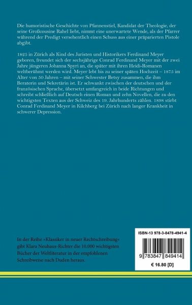 In der Reihe »Klassiker in neuer Rechtschreibung« gibt Klara Neuhaus-Richter die wichtigsten Bücher der Weltliteratur in der empfohlenen Schreibweise nach Duden heraus. Conrad Ferdinand Meyer: Der Schuss von der Kanzel Die humoristische Geschichte von Pfannenstiel, Kandidat der Theologie, der seine Großcousine Rahel liebt, nimmt eine unerwartete Wende, als der Pfarrer während der Predigt versehentlich einen Schuss aus einer präparierten Pistole abgibt. Erstdruck in: Zürcher Taschenbuch auf das Jahr 1878, Zürich 1877. Textgrundlage ist die Ausgabe: Conrad Ferdinand Meyer: Sämtliche Werke in zwei Bänden. Vollständiger Text nach den Ausgaben letzter Hand. Mit einem Nachwort von Erwin Laaths, München: Winkler, 1968. Die Paginierung obiger Ausgabe wird in dieser Neuausgabe als Marginalie zeilengenau mitgeführt. Neu herausgegeben und mit einer Biografie des Autors versehen von Klara Neuhaus-Richter, Berlin 2021. Umschlaggestaltung von Rainer Richter unter Verwendung einer Porträtzeichnung von Josefine Weinschrott. Gesetzt aus der Minion Pro, 11 pt. Henricus - Edition Deutsche Klassik GmbH Über den Autor: 1825 in Zürich als Kind des Regierungsrates Ferdinand Meyer in eine gut situierte Familie geboren, freundet sich der sechsjährige Conrad Ferdinand Meyer mit der zwei Jahre jüngeren Johanna Spyri an, die später mit ihren Heidi-Romanen weltberühmt werden wird. Meyer lebt bis zu seiner späten Hochzeit ¿ 1875 im Alter von 50 Jahren ¿ mit seiner Schwester Betsy zusammen, die ihm Beraterin und Sekretärin ist. Er schwankt zwischen der deutschen und der französischen Sprache, übersetzt umfangreich in beide Richtungen und schreibt schließlich auf Deutsch einen Roman und zehn Novellen, die zu den wichtigsten Texten aus der Schweiz des 19. Jahrhunderts zählen. Am 28. November 1898 stirbt Conrad Ferdinand Meyer in Kilchberg bei Zürich nach langer Krankheit in schwerer Depression.