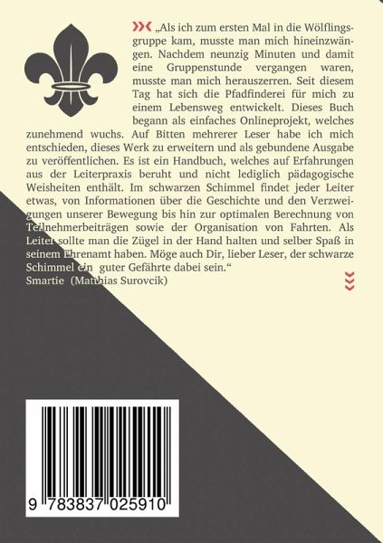"Als ich zum ersten Mal in die Wölflingsgruppe kam, musste man mich hineinzwängen. Nachdem neunzig Minuten und damit eine volle Gruppenstunde vergangen waren, musste man mich herauszerren. Seit diesem Tag hat sich die Pfadfinderei für mich zu einem Lebensweg entwickelt. Dieses Buch begann als einfaches Onlineprojekt welches zunehmend wuchs. Auf Bitten mehrer Leser habe ich mich entschieden, dieses Werk zu erweitern und als gebundene Ausgabe zu veröffentlichen. Es ist ein Handbuch, welches auf Erfahrungen aus der Leiterpraxis beruht und nicht lediglich pädagogische Weisheiten enthält. Im schwarzen Schimmel findet jeder Leiter etwas, von Informationen über die Geschichte und den Verzweigungen unserer Bewegung bis hin zur optimalen Berechnung von Teilnehmerbeiträgen sowie Organisation von Fahrten. Als Leiter sollte man die Zügel in der Hand halten und selber Spaß in seinem Ehrenamt haben. Möge auch Dir, lieber Leser, der schwarze Schimmel ein guter Gefährte dabei sein."