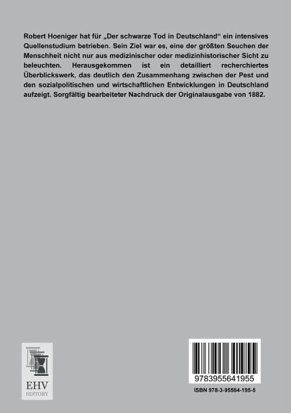 Robert Hoeniger hat für Der schwarze Tod in Deutschland ein intensives Quellenstudium betrieben. Sein Ziel war es, eine der größten Seuchen der Menschheit nicht nur aus medizinischer oder medizinhistorischer Sicht zu beleuchten. Herausgekommen ist ein detailliert recherchiertes Überblickswerk, das deutlich den Zusammenhang zwischen der Pest und den sozialpolitischen und wirtschaftlichen Entwicklungen in Deutschland aufzeigt. Sorgfältig bearbeiteter Nachdruck der Originalausgabe von 1882.