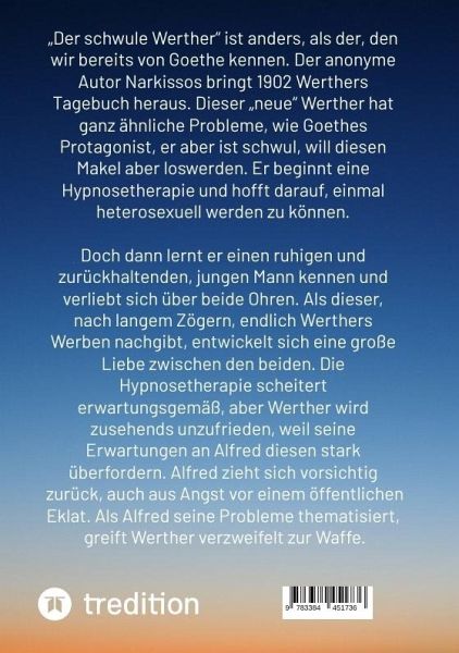 "Der schwule Werther" ist anders, als der, den wir bereits von Goethe kennen. Der anonyme Autor Narkissos bringt 1902 Werthers Tagebuch heraus. Dieser "neue" Werther hat ganz ähnliche Probleme, wie Goethes Protagonist, er aber ist schwul, will diesen Makel aber loswerden. Er beginnt eine Hypnosetherapie und hofft darauf, einmal heterosexuell werden zu können. Doch dann lernt er einen ruhigen und zurückhaltenden, jungen Mann kennen und verliebt sich über beide Ohren. Als dieser, nach langem Zögern, endlich Werthers Werben nachgibt, entwickelt sich eine große Liebe zwischen den beiden. Die…mehr
