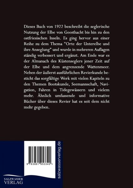 Dieses Buch von 1922 beschreibt die seglerische Nutzung der Elbe von Geesthacht bis hin zu den ostfriesischen Inseln. Es ging hervor aus einer Reihe zu dem Thema "Orte der Unterelbe und ihre Anseglung" und wurde in mehreren Auflagen ständig verbessert und ergänzt. Am Ende war es der Almanach des Küstenseglers jener Zeit auf der Elbe und dem angrenzende Wattenmeer. Neben der äußerst ausführlichen Revierkunde besticht das sorgfältige Werk mit vielen Kapiteln zu den Themen Bootskunde, Seemannschaft, Navigation, Fahren in Tidegewässern und vielem mehr. Ähnlich umfassende und informative Bücher über dieses Revier hat es seit dem nicht mehr gegeben.