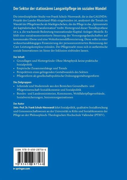 Die interdisziplinäre Studie von Frank Schulz-Nieswandt, die in das GALINDA-Projekt des Landes Rheinland-Pfalz eingebunden ist, analysiert die Trends im Wandel der Pflegebranche als Marktgeschehen, die die Pflege in das "Spinnennetz der kapitalistischen Transformation" treibt. Hintergrund dieser Trendhypothese ist u. a. die wachsende Bedeutung transnationaler Kapital-Anleger-Modelle. Es fehlt eine sozialraumorientierte Steuerung der Versorgungslandschaften auf kommunaler Ebene und eine Wohnformendifferenzierung. Diese sollte in einer wohnortunabhängigen Finanzierung der personenzentrierten Bemessung der Care-Leistungskomplexe münden. Der Pflegemarkt muss sich in authentische soziale Innovationen im Sinne der Inklusion einbinden lassen.