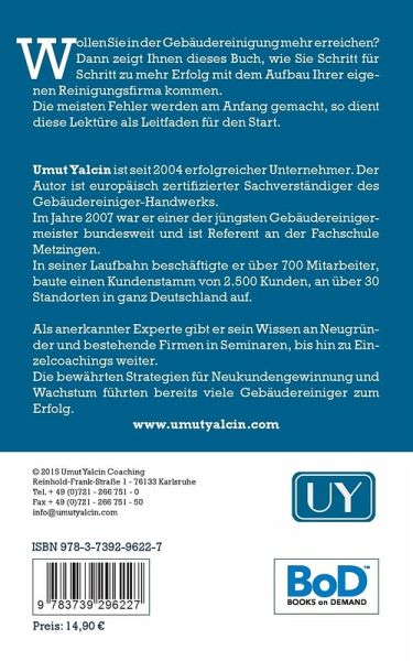 Wollen Sie in der Gebäudereinigung mehr erreichen?Dann zeigt Ihnen dieses Buch, wie Sie Schritt für Schritt zu mehr Erfolg mit dem Aufbau Ihrer eigenen Reinigungsfirma kommen.Die meisten Fehler werden am Anfang gemacht, so dient diese Lektüre als Leitfaden für den Start.Umut Yalcin ist seit 2004 erfolgreicher Unternehmer. Der Autor ist europäisch zertifizierter Sachverständiger des Gebäudereiniger-Handwerks.Im Jahre 2007 war er einer der jüngsten Gebäudereinigermeister bundesweit und ist Referent an der Fachschule Metzingen.In seiner Laufbahn beschäftigte er über 700 Mitarbeiter, baute einen Kundenstamm von 2.500 Kunden, an über 30 Standorten in ganz Deutschland auf.Als Businesscoach gibt er sein umfangreiches Wissen an Neugründer und bestehende Firmen in Seminaren, bis hin zu Einzelcoachings weiter.Die bewährten Strategien für Neukundengewinnung und Wachstum führten bereits viele Gebäudereiniger zum Erfolg.www.umutyalcin.com